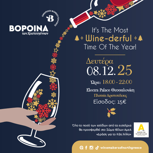 Τα «ΒορΟινά των Χριστουγέννων» επιστρέφουν στη Θεσσαλονίκη και προσκαλούν το κοινό σε μια βραδιά όπου το κρασί συναντά την αλληλεγγύη. Στόχος της εκδήλωσης είναι η στήριξη του Σώματος Φίλων ΑμεΑ «Δράση για το Κάτι Άλλο», καθώς όλα τα έσοδα των εισιτηρίων διατίθενται για φιλανθρωπικό σκοπό.