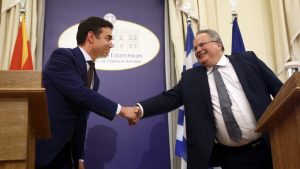 Ο υπουργός Εξωτερικών Νίκος Κοτζιάς (Δ) χαιρετάει τον ομόλογό του από την ΠΓΔΜ Nikola Dimitrov (Α) μετά τις κοινές δηλώσεις στο Υπουργείο Εξωτερικών, Αθήνα, την Τετάρτη 14 Ιουνίου 2017. ΑΠΕ-ΜΠΕ, ΣΥΜΕΛΑ ΠΑΝΤΖΑΡΤΖΗ JUNE 15, 2017