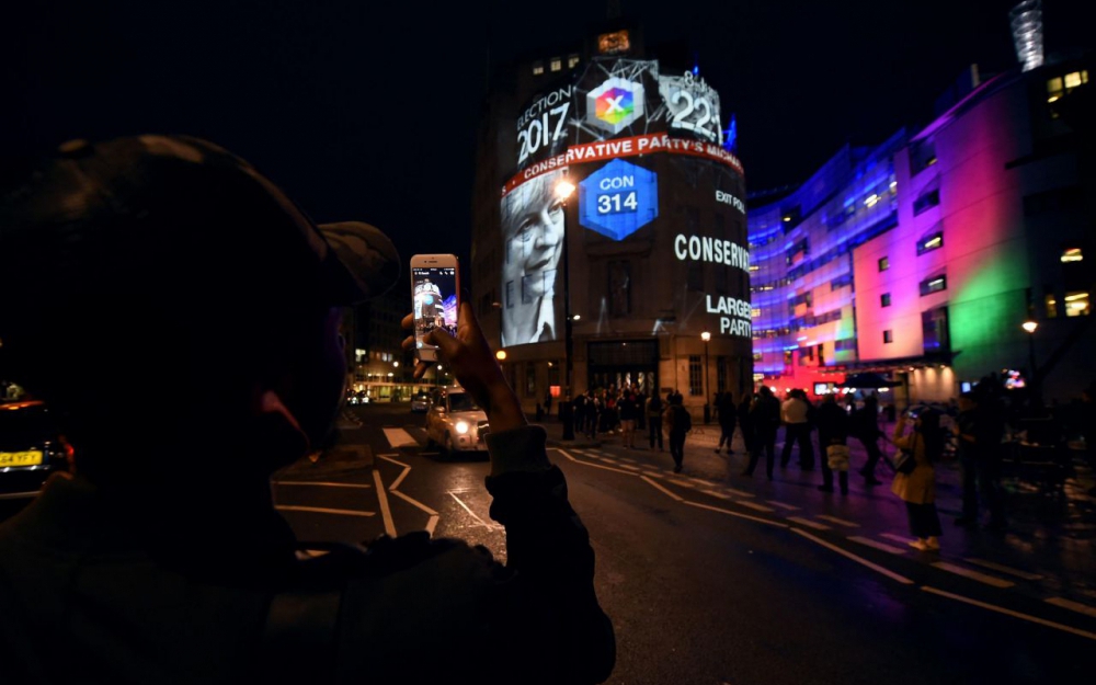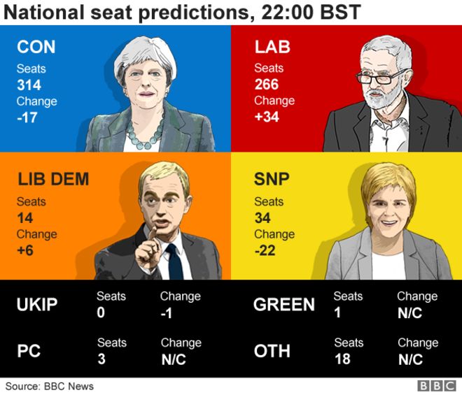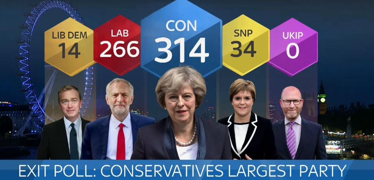 Το αποτέλεσμα διαφάνηκε ήδη από τη δημοσίευση των exit polls, όταν έγινε φανερό ότι το Συντηρητικό βρετανικό κόμμα κερδίζει μεν τις εκλογές, αλλά χάνει την απόλυτη πλειοψηφία που είχε. Εάν επιβεβαιωθεί το exit poll τότε οι Συντηρητικοί κερδίζουν τις εκλογές αλλά χάνουν 17 έδρες σε σχέση με τις 331 που εξασφάλισαν στις εκλογές του 2015. Οι Εργατικοί κερδίζουν 34 έδρες (από τις 232 που είχαν).