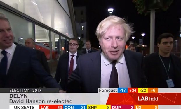 Οι ομιλίες δεν διακρίνονται πάντα για την ακρίβειά του, αλλά η έκφρασή του λέει πολλά. Πριν από δύο χρόνια όταν ο κόσμος περίμενε ότι ο Ντέηβιντ Κάμερον θα έχανε έδρες και θα ξεκινούσε ενδεχομέως μια κούρσα διαδοχής στους Τόρηδες με τον Τζόνσον πιθανό αντικαταστάτη του, ο πρώην δήμαρχος του Λονδίνου έδειχνε μάλλον συνοφρυωμένος κατά την άφιξή του στην περιφέρειά του. Αλλά αυτή τη φορά η έκφρασή του άλλα έλεγε… Έστω κι αν δεν έκανε σχόλια για το πώς εξελίσσεται η εκλογική νύχτα.