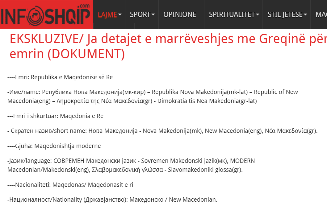 Σύμφωνα με το αλβανικό δημοσίευμα, η επίσημη  ονομασία που έχει συμφωνηθεί είναι «Δημοκρατία της Νέας Μακεδονίας» και εν συντομία «Νέα Μακεδονία». Η συμφωνία προβλέπει, επίσης,  λύσεις σε ζητήματα εκκλησιαστικά, γλώσσας και ταυτότητας, όχι μόνο των Σκοπιανών αλλά και των Ελλήνων Μακεδόνων