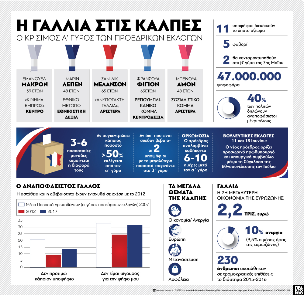 Πηγή: Γαλλικά exit polls: Πρώτος ο Μακρόν 23,7% -Δεύτερη η Λεπέν με 21,7% | iefimerida.grhttp://www.iefimerida.gr/news/332916/gallika-exit-polls-protos-o-makron-237-deyteri-i-lepen-me-217#ixzz4f67XCJIf