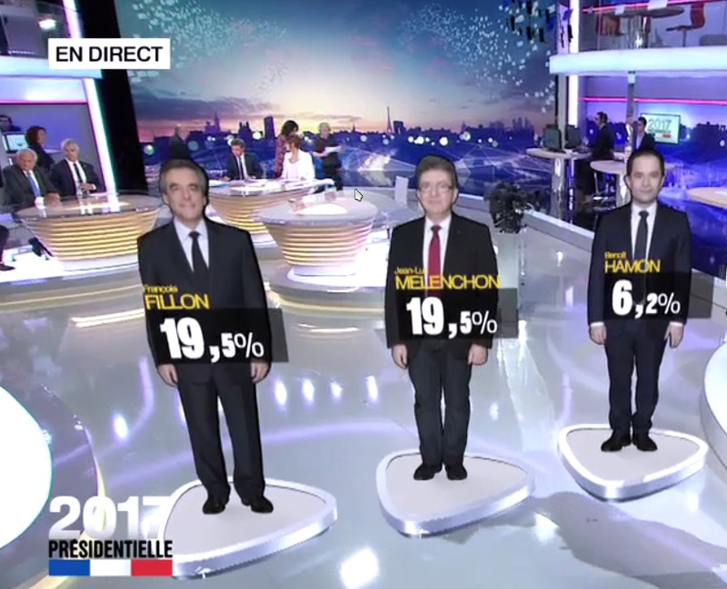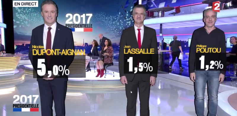Η Μαρίν Λεπέν, ο Φρανσουά Φιγιόν και ο Ζαν Λυκ Μελανσόν ακολουθούν μεταξύ 18%-20% των ψήφων. Αυτοί οι τρεις υποψήφιοι βρίσκονται σε ένα «μαντήλι τσέπης», γράφει το βελγικό Μέσο.