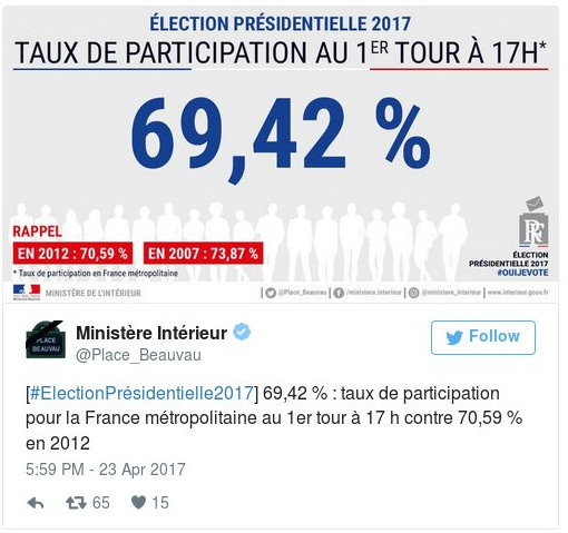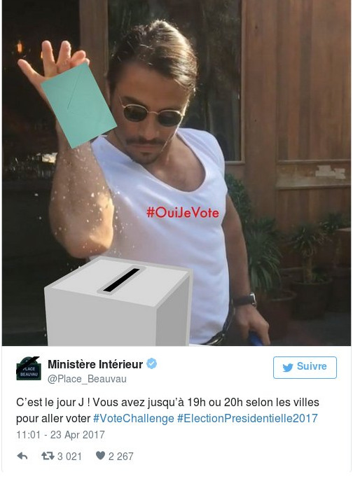«Είναι η ημέρα σήμερα! Εχετε ως τις 19:00 ή ως τις 20:00 ανάλογα με τις πόλεις για να ψηφίσετε στις προεδρικές», έγραψε το υπουργείο Εσωτερικών στο Twitter, ανεβάζοντας μια φωτογραφία του Τούρκου κρεοπώλη Nusret Gökçe, σταρ του Instagram, προσπαθώντας, έτσι, να παρακινήσει τους γάλλους ψηφοφόρους να πάνε να ψηφίσουν.