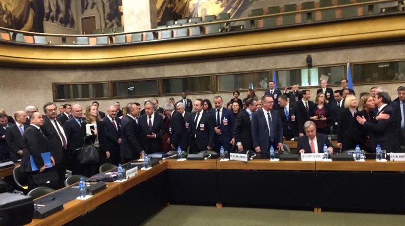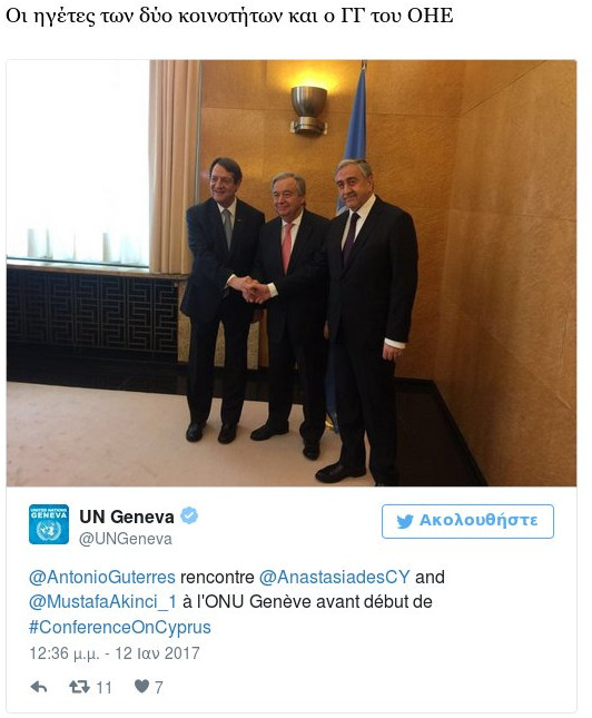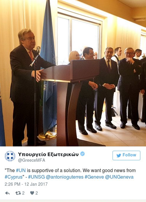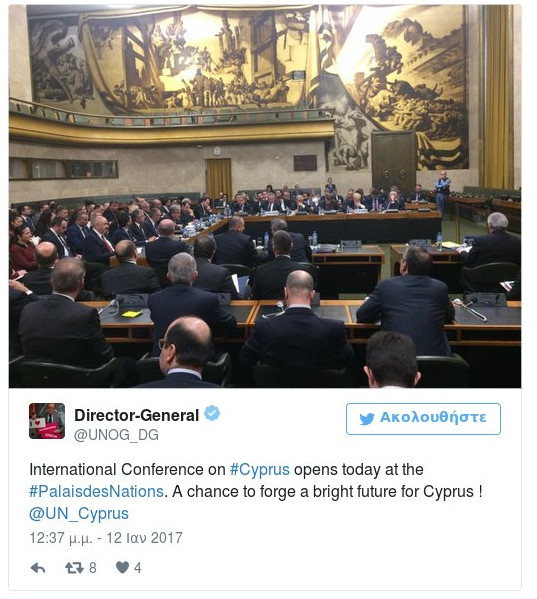 “Συγκλήθηκε σήμερα 12 Ιανουαρίου 2017 στη Γενεύη η Διάσκεψη για την Κύπρο, υπό την αιγίδα του γ. γ. των Ηνωμένων Εθνών, με την συμμετοχή της αυτού εξοχότητας Μουσταφά Ακιντζί και της αυτού εξοχότητηας Νίκου Αναστασιάδη, των υπουργών Εξωτερικών της Ελλάδας, της Τουρκίας και του Ηνωμένου Βασιλείου ως εγγυητριών δυνάμεων και την παρουσία της Ευρωπαϊκής Ένωσης ως παρατηρητή.