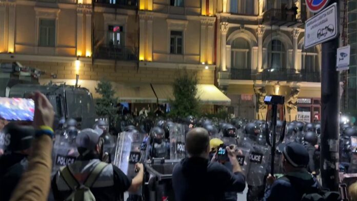 Η αστυνομία χρησιμοποίησε υδροβόλα στην οδό Atoneli κοντά στο Προεδρικό Μέγαρο ενώ υπάρχουν καταγγελίες και για χρήση σπρέι πιπεριού.