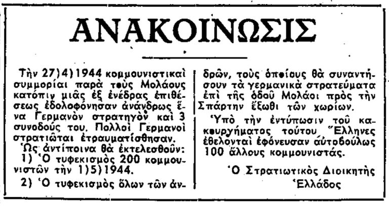 «Την 27ην Απριλίου 1944 κομμουνιστικαί συμμορίαι παρά τους Μολάους κατόπιν μιας εξ ενέδρας επιθέσεως εδολοφόνησαν ανάνδρως έναν Γερμανόν Στρατηγόν και τρεις συνοδούς του. Πολλοί Γερμανοί στρατιώται ετραυματίστησαν. Ως αντίποινα διατάχτηκε: