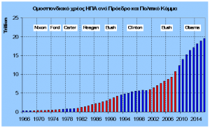 Σχήμα 1. Η εξέλιξη του αμερικάνικου δημόσιου χρέους ανά Πρόεδρο και πολιτικό κόμμα στην εξουσία. Είναι φανερή η επιτάχυνση στην αύξηση του χρέους επί προεδρίας Reagan και Bush και ο διπλασιασμός του επί Ομπάμα του οποίου η έναρξη της προεδρίας συμπίπτει με την εκδήλωση της κρίσης του 2008. Έκτοτε η Fed υποχρεώθηκε να τυπώνει συνεχώς δολάρια προκειμένου να αποφευχθεί μια παγκόσμια κρίση τύπου 1929 (το περίφημο πρόγραμμα Asset reflation του Ben Bernanke)…