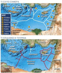 Οι δυο αυτοί χάρτες δείχνουν ξεκάθαρα τις οριοθετήσεις της Ελλάδας και της Τουρκίας. Η Ελλάδα δείχνει την οριοθέτηση της ΑΟΖ της βασισμένη στην UNCLOS του 1982, ενώ η Τουρκία, με τον δικό της χάρτη παραβιάζει κάθε έννοια του Δίκαιου της Θάλασσας.