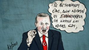 Όταν ο ισλαμιστής Πρόεδρος της γειτονικής χώρας βρίσκεται σε δύσκολη θέση, καταφεύγει στην προσφιλή του τακτική: Επιτίθεται στο Εβραϊκό Κράτος και ρίχνει και μερικές βολές στην Ελλάδα και την Κύπρο έτσι για να μας υπενθυμίζει τις διεκδικήσεις του στο Αιγαίο και στον κατεχόμενο βορρά.
