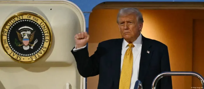 Ο Αμερικανός Πρόεδρος Ντόναλντ Τραμπ εμφανίζεται να χτυπά γροθιά στο Air Force One στο αεροδρόμιο Χανέντα στο Τόκιο στις 27 Οκτωβρίου 2025.