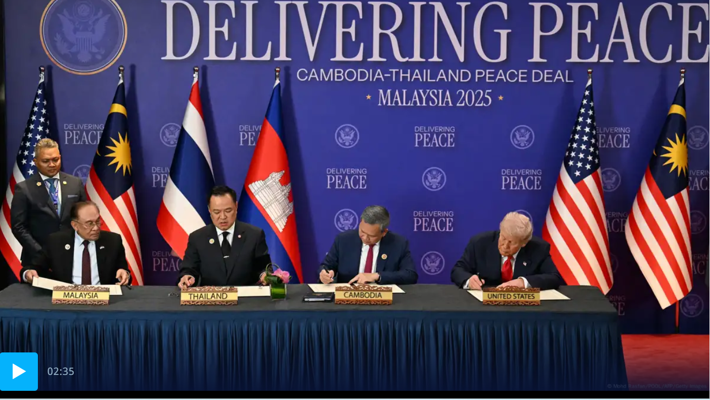 Χαρακτηρίστηκε ως «Συμφωνία Ειρήνης Κουάλα Λουμπούρ» και βασίστηκε σε εκεχειρία που επιτεύχθηκε μετά την παρέμβαση του Τραμπ τον Ιούλιο, όταν η διαμάχη στα σύνορα Ταϊλάνδης–Καμπότζης, που κρατούσε δεκαετίες, ξέσπασε σε πέντε ημέρες θανατηφόρων συγκρούσεων.