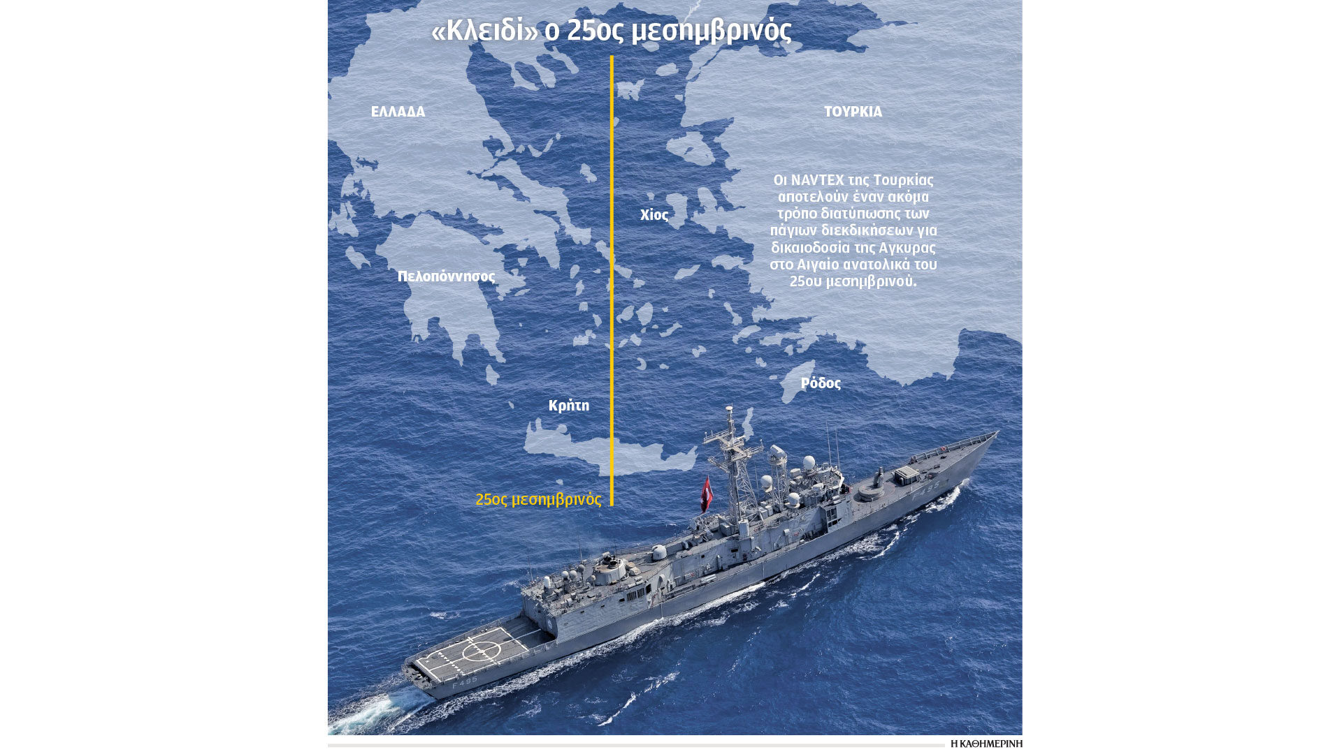 1. Η Τουρκία με την 2ετή μεγάλης διάρκειας NAVTEX 0060/2026 (Navigational Telex) που είναι μια αυτοματοποιημένη υπηρεσία με άμεσες ναυτιλιακές προειδοποιήσεις, έχει εξαγγείλει έως τις 31 Δεκεμβρίου 2027, ότι δεσμεύει όλη την περιοχή από τον 25ο Μεσημβρινό, καθώς όπως αναγράφεται “δεν έχει γίνει οριοθέτηση της υφαλοκρηπίδας μεταξύ των 2 χωρών Ελλάδας και Τουρκίας”