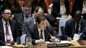 Vladimir Safronkov (C), Russia’s Deputy Ambassador to the United Nations, addresses an emergency meeting of the United Nations Security Council about a chemical attack in Syria at United Nations headquarters in New York, New York, USA, 05 April 2017. EPA, JUSTIN LANE APRIL 6, 2017