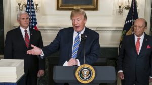 File Photo: US President Donald J. Trump (C), alongside Vice President Mike Pence (L) and Secretary of Commerce Wilbur Ross (R) in the Diplomatic Room of the White House in Washington, DC, USA. EPA, JIM LO SCALZO MARCH 26, 2018