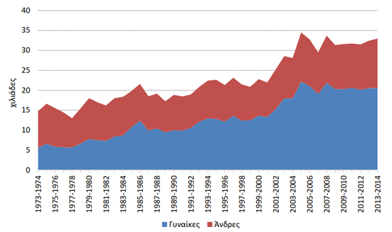 Εξέλιξη αριθμού πτυχιούχων πανεπιστημιακών ιδρυμάτων, 1973-2013