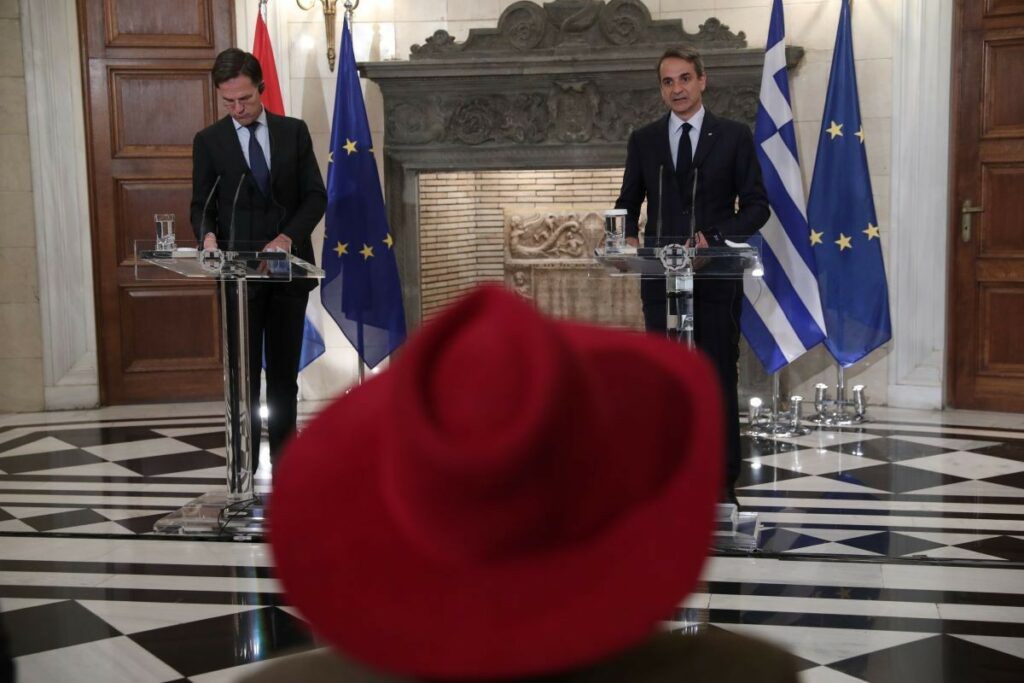 FILE PHOTO: Ο πρωθυπουργός Κυριάκος Μητσοτάκης (Δ) με τον πρωθυπουργό της Ολλανδίας Mark Rutte (Α), κάνουν κοινές δηλώσεις κατά τη διάρκεια της συνάντησής τους, στο Μέγαρο Μαξίμου, την Τρίτη 9 Νοεμβρίου 2021. Με το κόκκινο καπέλο η Ολλανδέζα δημοσιογράφος. ΑΠΕ-ΜΠΕ, ΓΙΩΡΓΟΣ ΒΙΤΣΑΡΑΣ