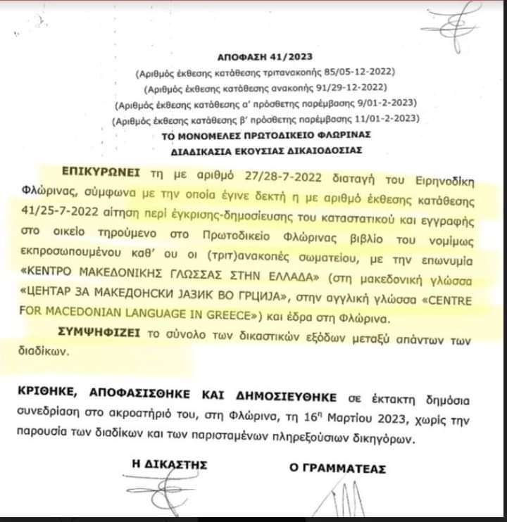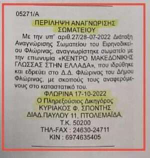 Στις 28 Ιουλίου 2022, το Ειρηνοδικείο Φλωρίνης εξέδωσε την υπ’ αριθμόν 27 Διάταξή του με την οποία αναγνώρισε ένα σωματείο με την επωνυμία «Κέντρο Μακεδονικής Γλώσσας στην Ελλάδα». Περίληψη της αναγνώρισης του σωματείου δημοσιεύτηκε στο Δελτίο Δικαστικών Δημοσιεύσεων (05271/Α/17-10-2022).