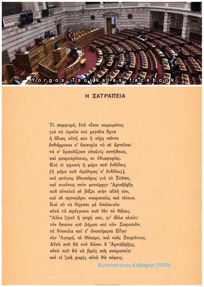 «Εντέλει υπάρχει δημοκρατία;» απορούν οι πολίτες, παρατηρώντας τους βουλευτές, ενίοτε άβουλους, να ψηφίζουν καταναγκαστικά, ό,τι εισάγουν οι κομματικές ηγεσίες, προκειμένου να αποφύγουν την επαπειλούμενη ρήξη με τα κόμματά τους, που ως δαμόκλειος σπάθη επικρέμεται αδιαλείπτως επί των κεφαλών τους, με κίνδυνο να αφανιστούν πολιτικά, και προκειμένου να διατηρήσουν τις βουλευτικές έδρες τους, ως όμως πολιτικά κενοδοχεία, και άλλες καβαφικές σατραπείες… «Καὶ σὺ τὰ δέχεσαι μὲ ἀπελπισία/ αὐτὰ τὰ πράγματα ποῦ δὲν τὰ θέλεις./ Ἄλλα ζητεῖ ἡ ψυχή σου, γι’ ἄλλα κλαίει˚/ τὸν ἔπαινο τοῦ Δήμου καὶ τῶν Σοφιστῶν,/ τὰ δύσκολα καὶ τ’ ἀνεκτίμητα Εὖγε˚/ τὴν Ἀγορά, τὸ Θέατρο, καὶ τοὺς Στεφάνους./ Αὐτὰ ποῦ θὰ στὰ δώσει ὁ Ἀρταξέρξης,/ αὐτὰ ποῦ θὰ τὰ βρεῖς στὴ σατραπεία˚/ καὶ τί ζωὴ χωρὶς αὐτὰ θὰ κάμεις.» (Κωνσταντίνου Καβάφη, Η Σατραπεία)…
