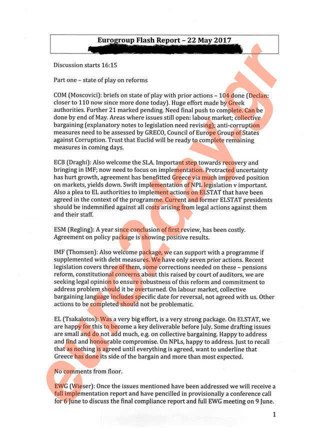 Σύμφωνα με το euro2day.gr, το οποίο δίνει στη δημοσιότητα τα πρακτικά του Eurogroup στις 22 Μαΐου, προκύπτει ότι ο Γερμανός υπουργός Οικονομικών Βόλφγκανγκ Σόιμπλε δεν ήταν διατεθειμένος να κάνει υποχωρήσεις και δεν θα δεχόταν τίποτα πέραν της απόφασης του 2016. Δείτε μερικά αποσπάσματα από τα «καυτά» πρακτικά της συνεδρίασης.