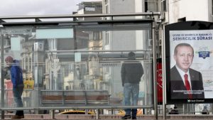 People wait near picture of Turkish President Recep Tayyip Erdogan in Istanbul, Turkey, 27 January 2017.