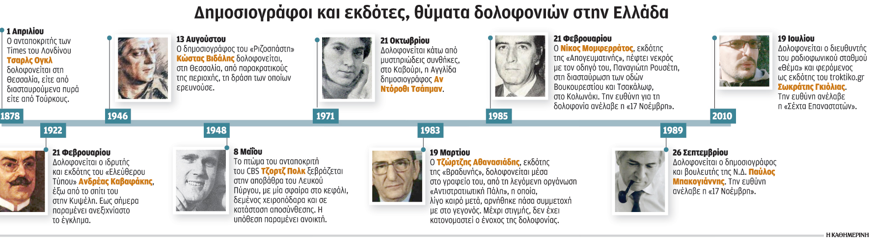 Η «Κ», με αφορμή τον θάνατο της Κιμ Ουόλ και την υπενθύμιση δολοφονιών όπως της Τζιλ Ντάντον του BBC (για τους υπαιτίους της οποίας υπάρχουν διάφορα σενάρια) το 1999, της Ρωσίδας αντιπουτινικής δημοσιογράφου Αννα Στεπάνοβνα Πολιτκόφσκαγια, το 2006, του Μεξικανού συναδέλφου της Αρμάντο Ροντρίγκεζ, το 2008, διότι τα είχε βάλει με τα καρτέλ ναρκωτικών, θυμάται τρεις υποθέσεις δολοφονιών δημοσιογράφων στην Ελλάδα, που παραμένουν ανεξιχνίαστες, καθώς ποτέ δεν δόθηκαν στη δημοσιότητα αδιάσειστα στοιχεία. Πρόκειται για τις δολοφονίες του Ανδρέα Καβαφάκη το 1922, της Αν Ντόροθι Τσάπμαν το 1971 και του Τζορτζ Πολκ το 1948.
