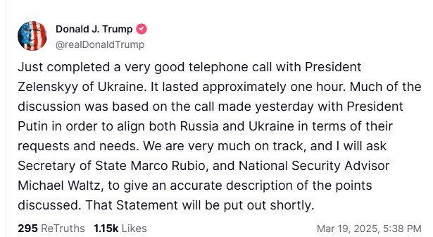 «Μόλις ολοκληρώθηκε μια πολύ καλή τηλεφωνική επικοινωνία με τον Πρόεδρο Ζελένσκι της Ουκρανίας. Διήρκεσε περίπου μία ώρα. Μεγάλο μέρος της συζήτησης βασίστηκε στο τηλεφώνημα που έγινε χθες με τον Πρόεδρο Πούτιν προκειμένου να ευθυγραμμιστούν τόσο η Ρωσία όσο και η Ουκρανία όσον αφορά τα αιτήματα και τις ανάγκες τους. Είμαστε σε καλό δρόμο και θα ζητήσω από τον υπουργό Εξωτερικών Μάρκο Ρούμπιο και τον σύμβουλο Εθνικής Ασφάλειας Μάικλ Βαλτς να δώσουν μια ακριβή περιγραφή των σημείων που συζητήθηκαν. Η δήλωση αυτή θα δημοσιευθεί σύντομα».