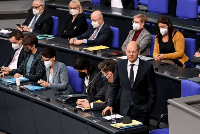 Στη συνέχεια, ήταν η σειρά του Σολτς να μιλήσει. Κανονικά, ο κεντροαριστερός Σοσιαλδημοκράτης (SPD) διαβάζει κάποια προκατασκευασμένη δήλωση έως ότου το ακροατήριό του αποκοιμηθεί. Αυτή την εβδομάδα, όμως, ήταν δυναμικός.