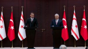 Ο Τούρκος Πρωθυπουργός Μπιναλί Γιλντιρίμ με τον παράνομο ψευτο-“πρωθυπουργό” Τουφάν Ερχουρμάν. Φωτογραφία Γραφείο του Πρωθυπουργού της Τουρκίας.