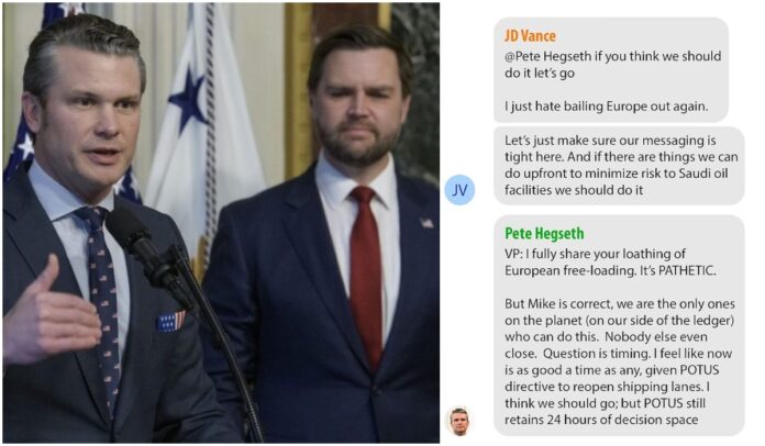 Μηνύματα-βόμβα που διέρρευσαν τη Δευτέρα (24/3), αποκάλυψαν τον βαθμό περιφρόνησης που νιώθουν ορισμένα από τα βασικά μέλη του υπουργικού συμβουλίου των ΗΠΑ υπό τον Πρόεδρο της χώρας, Ντόναλντ Τραμπ, για τους «ελεύθερους» Ευρωπαίους συμμάχους τους.
