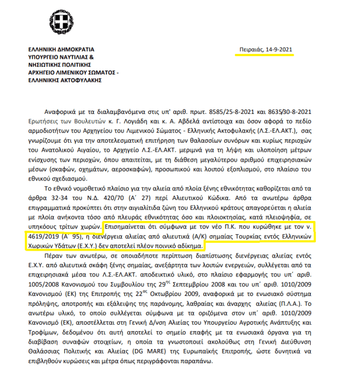 Οι anixneuseis.gr αναδημοσιεύουν κείμενο απο το reader.gr το οποίο αποκαλύπτει έγγραφο που υπογράφεται απο τον αρχηγό του Λιμενικού Σώματος σύμφωνα με το οποίο, ο νέος Π.Κ. που κυρώθηκε με τον ν. 4619/2019 (Α’ 95) (Κυβέρνηση ΣΥΡΙΖΑ) η διενέργεια αλιείας από αλιευτικά (Α/Κ) σημαίας Τουρκίας εντός Ελληνικών Χωρικών Υδάτων (Ε.Χ.Υ.) δεν αποτελεί πλέον ποινικό αδίκημα».