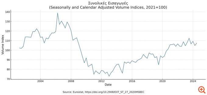Μετά την οικονομική κρίση, οι εισαγωγές ως ποσοστό του ΑΕΠ σημείωσαν αξιοσημείωτη πτώση. Ωστόσο, από το 2022 και έπειτα, καταγράφεται σταθεροποίηση σε υψηλότερα επίπεδα — ακόμη και εξαιρώντας τα πετρελαιοειδή. Η αυξητική αυτή τάση, ωστόσο, δεν είναι από μόνη της ενδεικτική ούτε θετικής ούτε αρνητικής εξέλιξης. Η πραγματική σημασία βρίσκεται αν αναλυθεί η σύνθεση των εισαγόμενων αγαθών.