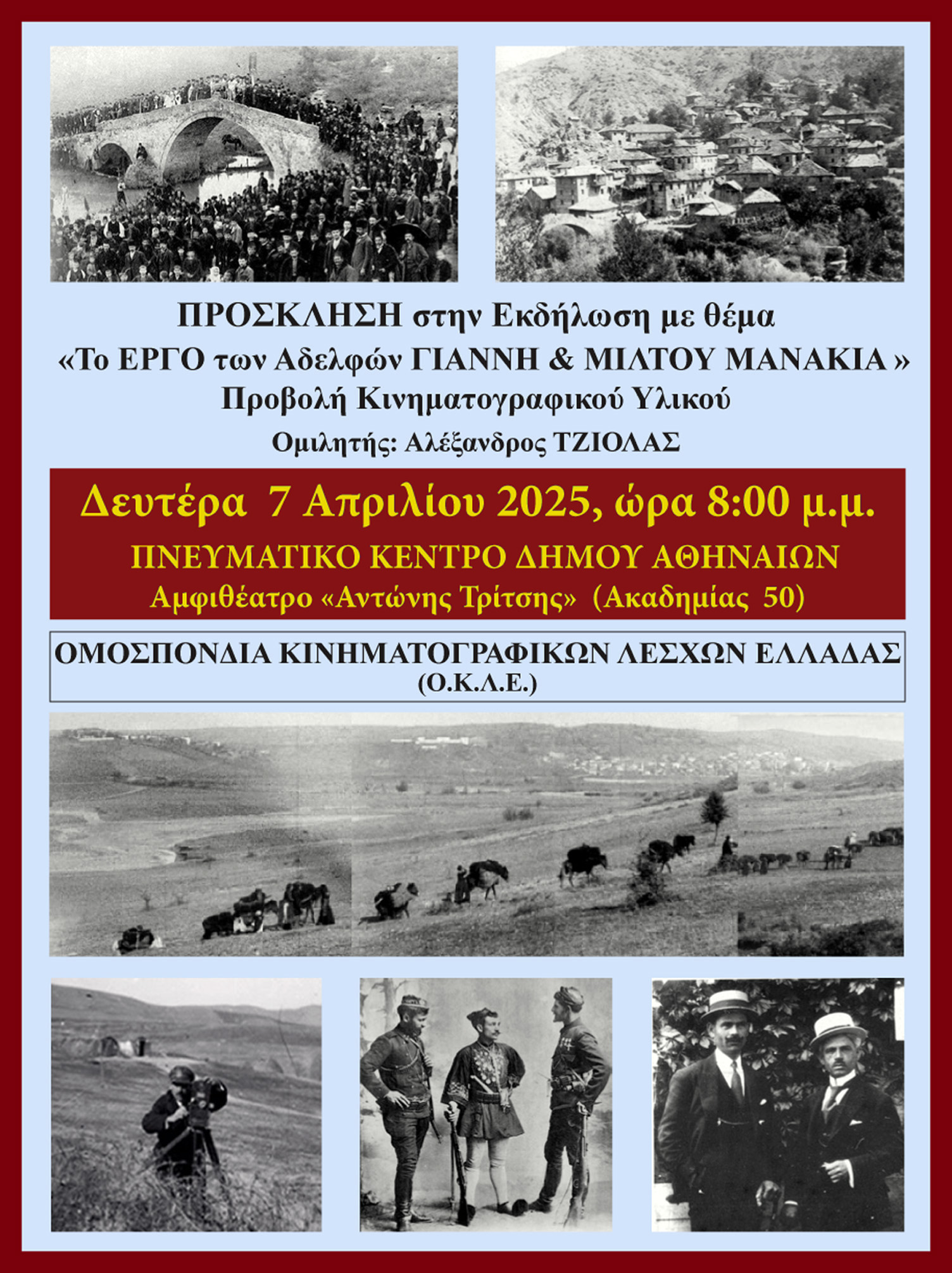 - Προβάλλουμε ΟΛΕΣ τις ταινίες τους. Οι [42] αυτές μικρού μήκους κινηματογραφούμενες σκηνές, έχουν σύνολο 35΄ και είναι γυρισμένες σε διάφορα σημεία στην Πίνδο και στα Δυτικά Βαλκάνια. Οι αφοί Μανάκια είναι οι πρώτοι κινηματογραφιστές των Βαλκανίων με τις πρώτες σκηνές που γυρίστηκαν το 1905 στην Αβδέλλα Γρεβενών με θέματα την «γιαγιά Δέσποινα» ηλικίας 117 ετών και τις «Υφάντρες».