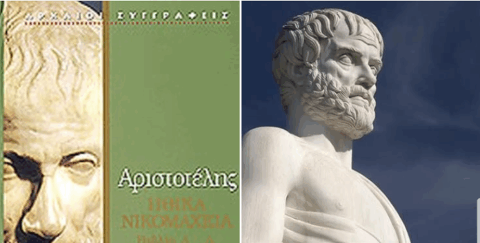 Γράφει ο Αριστοτέλης στα Ηθικά Νικομάχεια: «…ἔστιν ἄρα ἡ ἀρετὴ ἕξις προαιρετική, ἐν μεσότητι οὖσα τῇ πρὸς ἡμᾶς, ὡρισμένῃ λόγῳ καὶ ᾧ ἂν ὁ φρόνιμος ὁρίσειεν. μεσότης δὲ δύο κακιῶν, τῆς μὲν καθ᾽ ὑπερβολὴν τῆς δὲ κατ᾽ ἔλλειψιν· καὶ ἔτι τῷ τὰς μὲν ἐλλείπειν τὰς δ᾽ ὑπερβάλλειν τοῦ δέοντος ἔν τε τοῖς πάθεσι καὶ ἐν ταῖς πράξεσι, τὴν δ᾽ ἀρετὴν τὸ μέσον καὶ εὑρίσκειν καὶ αἱρεῖσθαι. διὸ κατὰ μὲν τὴν οὐσίαν καὶ τὸν λόγον τὸν τὸ τί ἦν εἶναι λέγοντα μεσότης ἐστὶν ἡ ἀρετή, κατὰ δὲ τὸ ἄριστον καὶ τὸ εὖ ἀκρότης.». Το οποίο όταν το αποδώσουμε στα νέα ελληνικά -σημειώνω να ‘’το αποδώσουμε’’, όχι να το μεταφράσουμε, αφού η Ελληνική Γλώσσα είναι μέσα στους αιώνες ενιαία, λέει:
