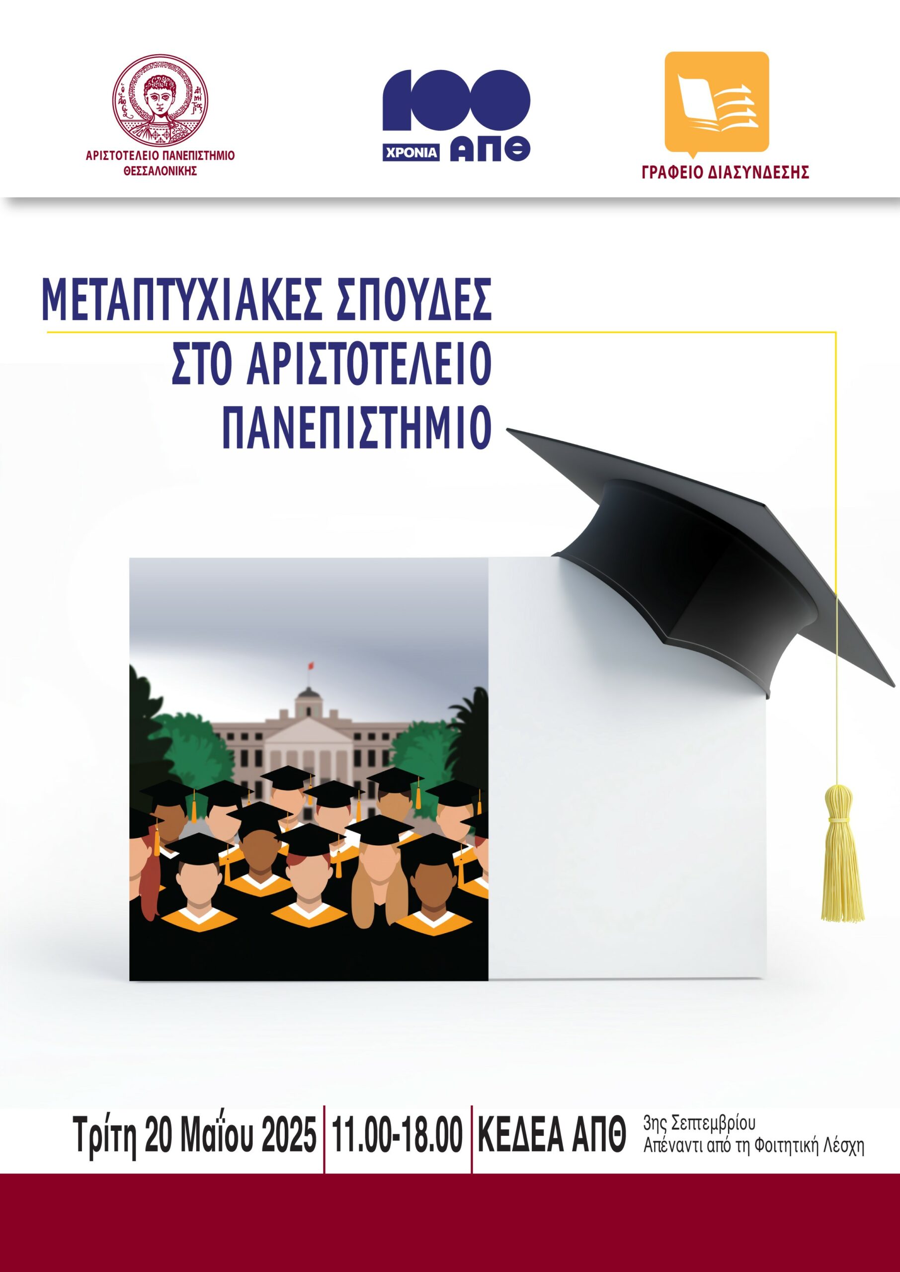 Οι Μεταπτυχιακές Σπουδές του Αριστοτέλειου Πανεπιστημίου Θεσσαλονίκης βρίσκονται στο επίκεντρο ενημερωτικής εκδήλωσης που διοργανώνει το Γραφείο Διασύνδεσης του ΑΠΘ, την Τρίτη 20 Μαΐου 2025 και ώρες 11.00 με 18.00, στο ΚΕΔΕΑ του ΑΠΘ.