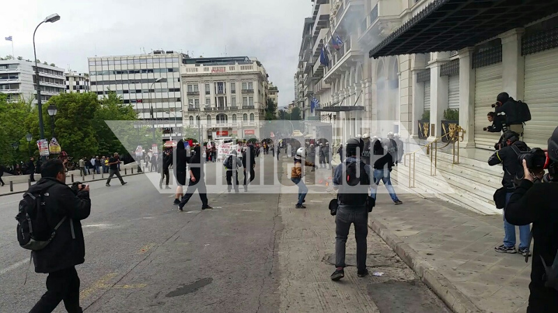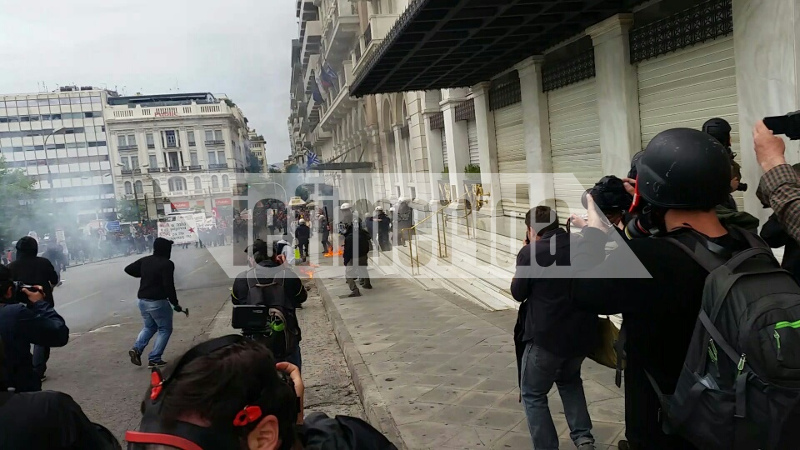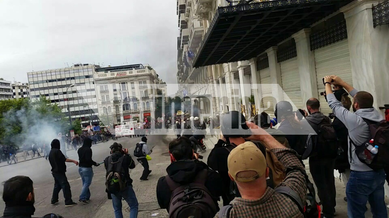 Οι αντιεξουσιαστές μόλις έφτασαν στην πλατεία Συντάγματος επιτέθηκαν με ρόπαλα, σφυριά και πέτρες σε διμοιρία των ΜΑΤ κοντά στο ξενοδοχείο Μεγάλη Βρετάνια. Οι αστυνομικοί απάντησαν με χρήση χημικών.
