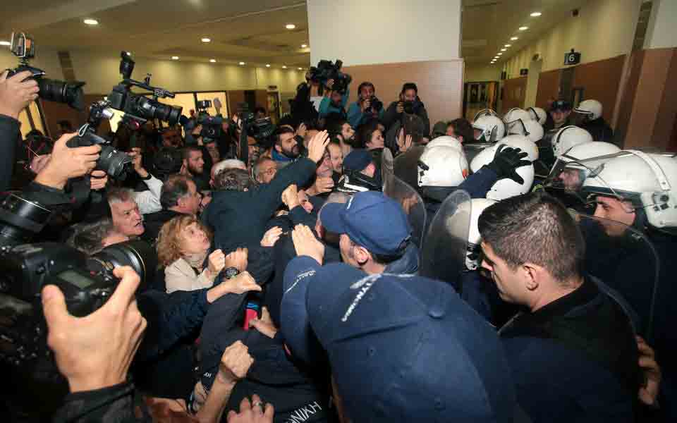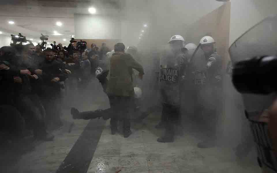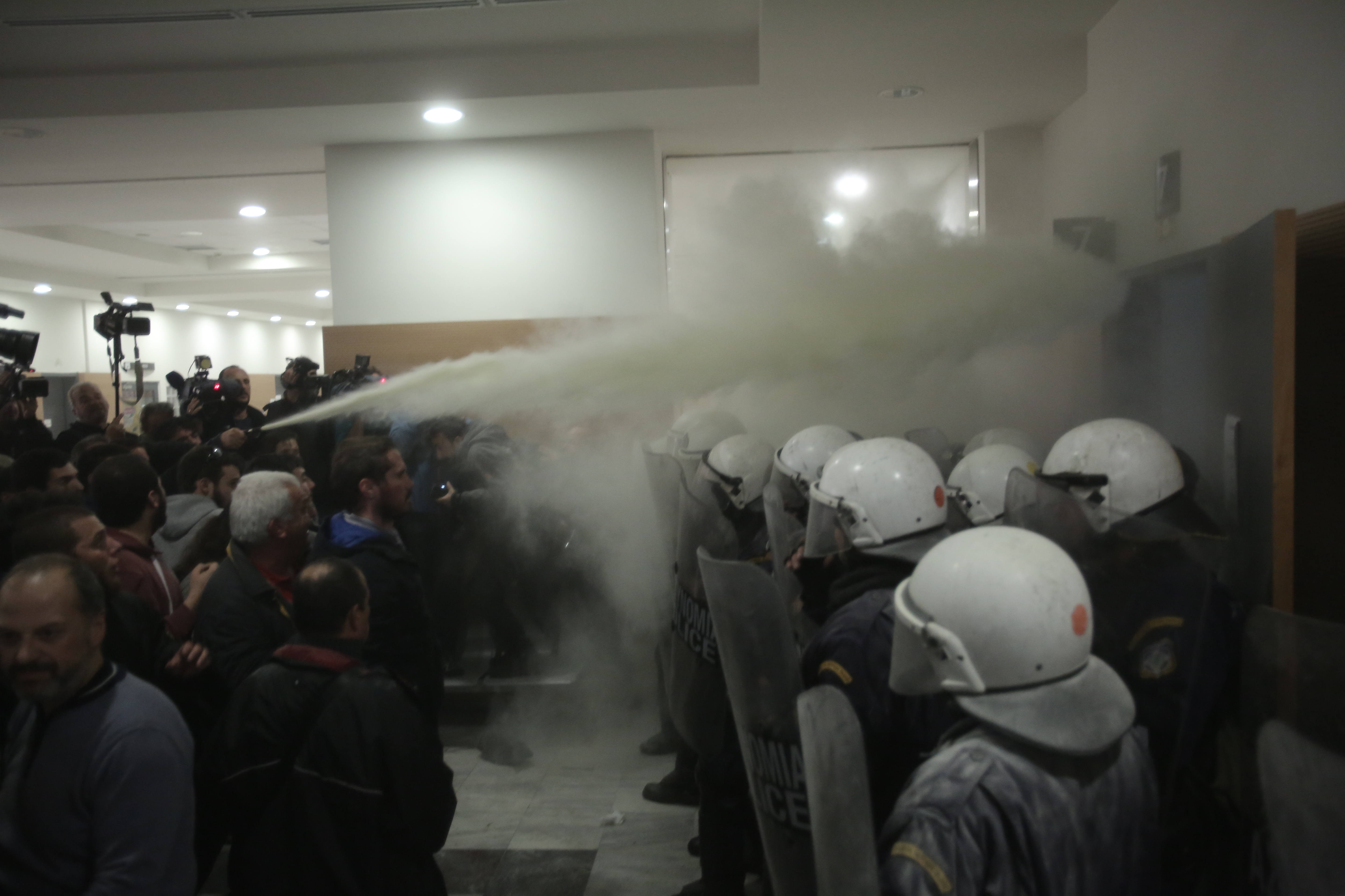 Οι διαμαρτυρόμενοι εξαπέλυσαν υβριστικά συνθήματα και επιχείρησαν να μπουν στην αίθουσα του δικαστηρίου, ώστε να προσεγγίσουν τους συμβολαιογράφους. Σε απάντηση τα ΜΑΤ έκαναν χρήση χημικών καθιστώντας αποπνικτική την ατμόσφαιρα.