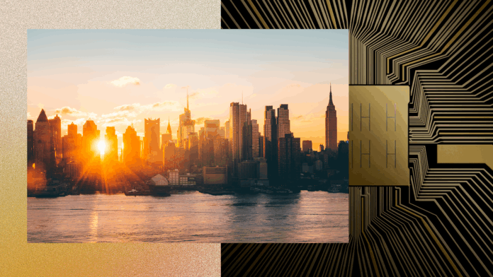 Φωτογραφία: μια σύνθετη εικόνα παρουσιάζεται στον αριστερό μισό ορίζοντα της πόλης με τον ήλιο να δύει, βάφοντας τα ψηλά κτήρια με πορτοκαλί φως, ενώ στα δεξιά απεικονίζεται ένας καλλιτεχνικός σχεδιασμός κυκλώματος σε μαύρο και χρυσό, συμβολίζοντας τη σύγκλιση του αστικού βίου με την τεχνολογική πρόοδο.