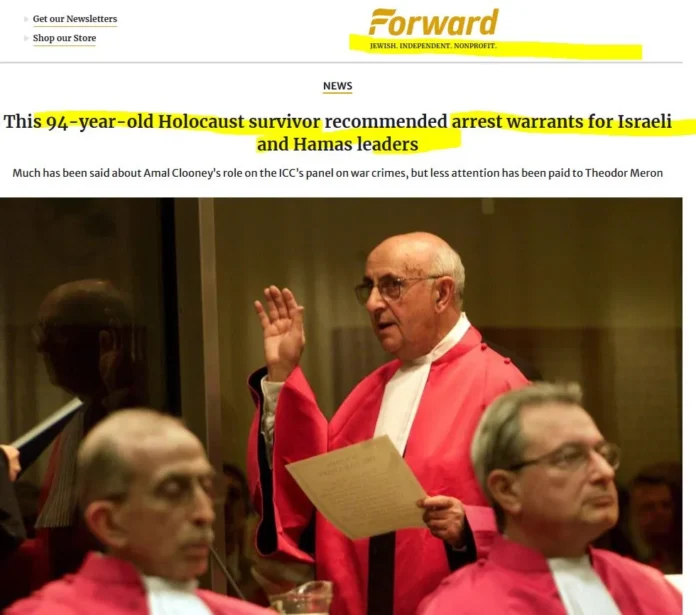 «Σε ηλικία 14 ετών, είχε επιζήσει από το Ολοκαύτωμα. στα 44, ήταν Ισραηλινός διπλωμάτης. Τώρα, σε ηλικία 94 ετών, ο Theodor Meron συνέστησε στο Διεθνές Ποινικό Δικαστήριο να ζητήσει εντάλματα σύλληψης των ηγετών του Ισραήλ και της Χαμάς για εγκλήματα πολέμου και εγκλήματα κατά της ανθρωπότητας», γράφει η Forward -εβραϊκή, ανεξάρτητη και μη κερδοσκοπική ιστοσελίδα- σύμφωνα με τον τίτλο της.