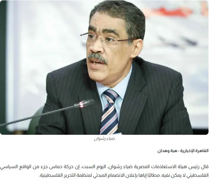 Ο επικεφαλής της Αιγυπτιακής Κρατικής Υπηρεσίας Πληροφοριών, Ντίαα Ρασουάν, δήλωσε το Σάββατο ότι η Χαμάς αποτελεί αναμφισβήτητο μέρος της παλαιστινιακής πολιτικής πραγματικότητας, καλώντας την να ανακοινώσει την αρχική της ένταξη στην Οργάνωση για την Απελευθέρωση της Παλαιστίνης.