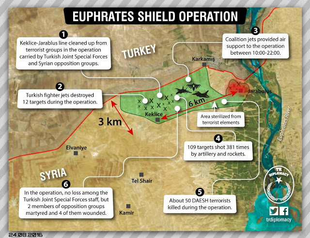 - η Τουρκία διεξάγει επιχειρήσεις συνδυασμένων όπλων σε πολλούς τομείς, προστατεύοντας τα συριακά χωριά που καταλαμβάνει καθώς και τους πληθυσμούς και τις υποδομές που απελευθερώνει από το ISIL,