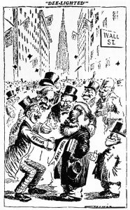 Προμήνυμα: Γελοιογραφία του Ρόμπερτ Μίνορ στη St. Louis Post-Dispatch του 1911. Ο Καρλ Μαρξ κρατώντας υπό μάλης το Κεφάλαιο γίνεται ενθουσιωδώς δεκτός στη Γουώλ Στριτ από γνωστούς στην εποχή τους χρηματιστές όπως οι Mόργκαν, Ροκφέλερ, Κάρνετζι, Πέρκινς. Πίσω ακριβώς από τον Μαρξ ο Τέντυ Ρούζβελτ, ηγέτης του προοδευτικού κόμματος…
