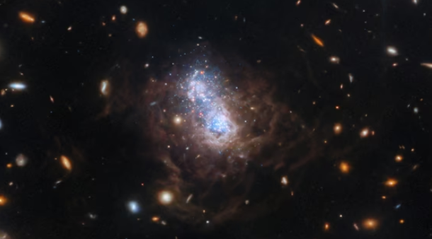Δύο μικρές συγκεντρώσεις φωτεινών άστρων εμφανίζονται στο κέντρο ενός μικρού ακανόνιστου γαλαξία, περιβαλλόμενες από ένα αχνό νέφος σκόνης, με φόντο πολλούς άλλους μακρινούς γαλαξίες.
