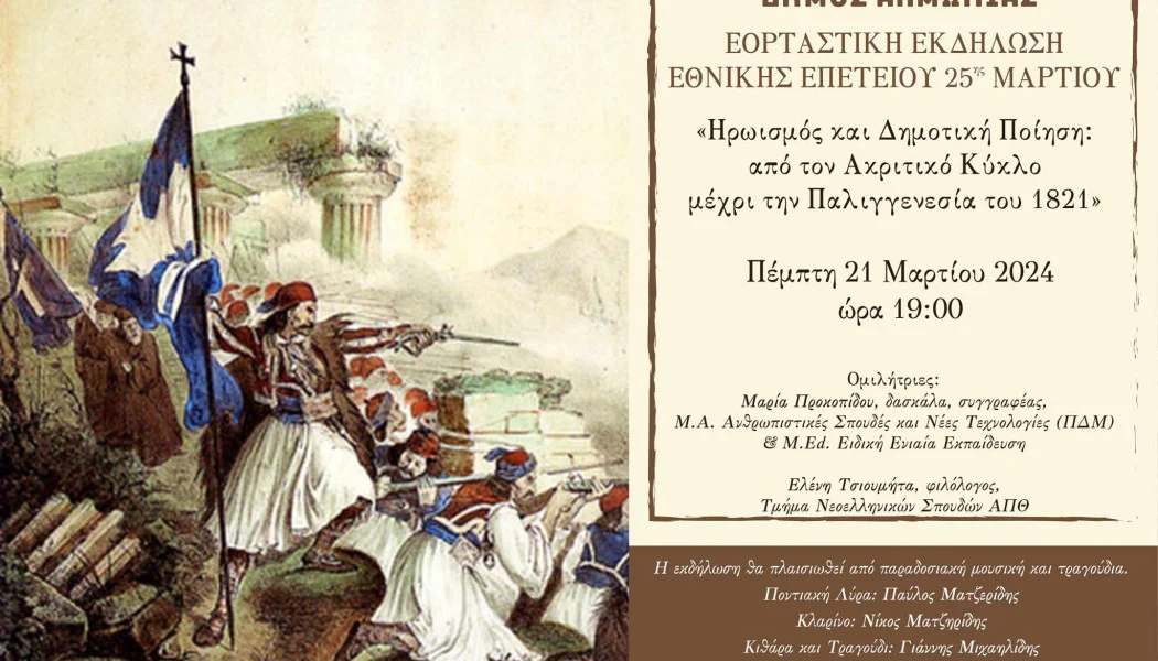 Εκδήλωση για την Εθνική Επέτειο της 25ης Μαρτίου 1821 πραγματοποιεί ο Δήμος Αλμωπίας την Πέμπτη 21 Μαρτίου 2024, στις 19:00, στο Ξενιτίδειο Πνευματικό Κέντρο Αριδαίας, με ομιλήτριες τη δασκάλα και συγγραφέα, Μαρία Προκοπίδου και τη φιλόλογο, Ελένη Τσιουμήτα.