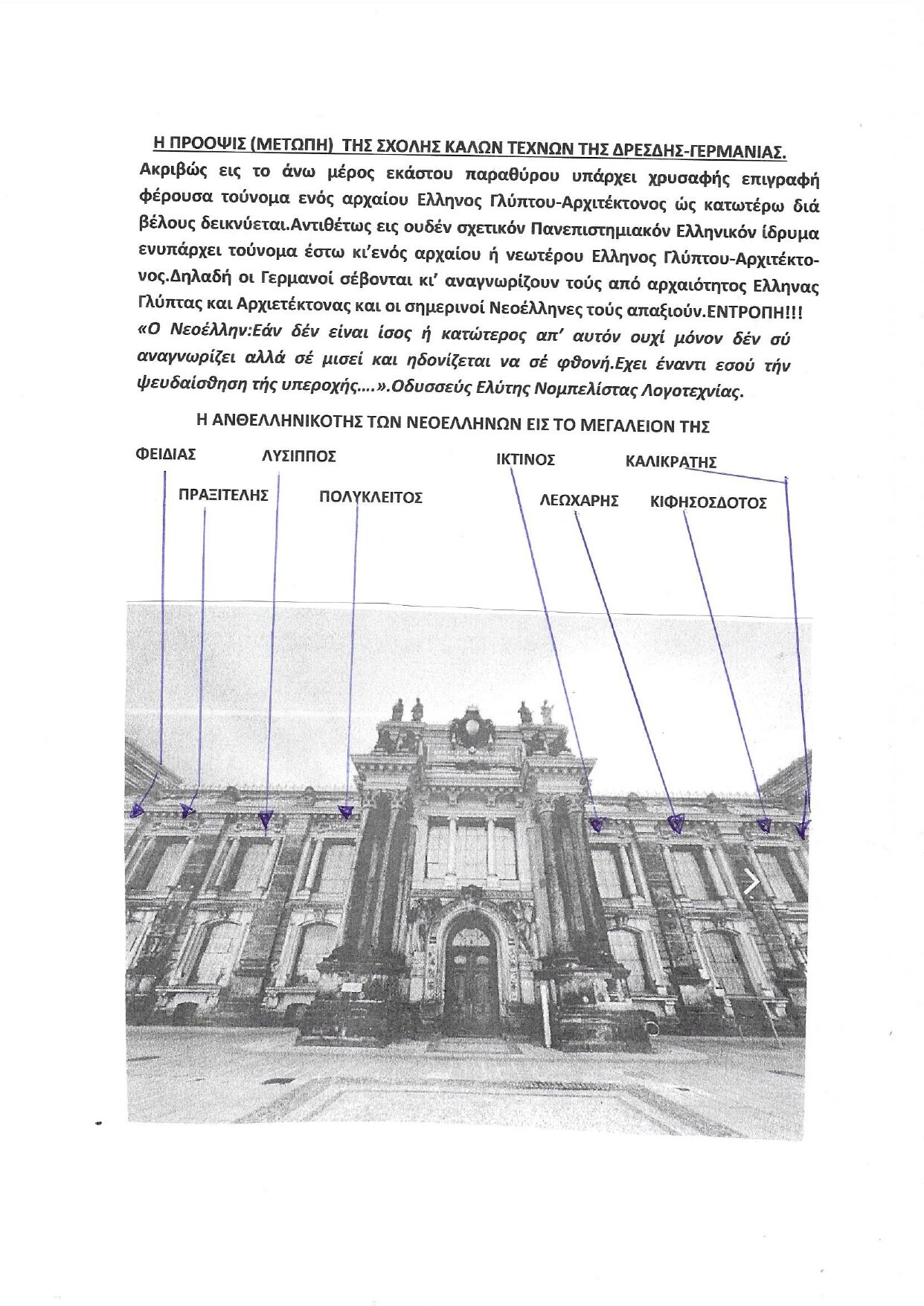 .α.Εις το επιβλητικόν και μεγαλοπρεπές κτίριον τής Σχολής Καλών Τεχνών τής ΔΡΕΣΔΗΣ και δή επί τής εμπροσθίας κεντρικής μετώπης καί ακριβώς άνω εκάστου παραθύρου διά χρυσαφούς χρώματος είναι αναγεγραμμένα τά ονόματα οκτώ αρχιτεκτόνων και γλυπτών τής Αρχαίας Ελλάδος ήτοι τών Φειδίου,Ικτίνου,Πραξιτέλους,Λυσίππου,