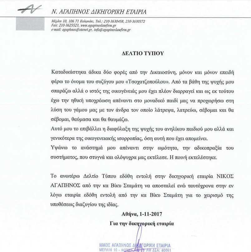 Σε δήλωσή της αναφέρει ότι καταδικάστηκε άδικα μόνο και μόνο επειδή φέρει το επίθετο «Τσοχατζοπούλου». Η Βίκυ Σταμάτη ανακοινώνει ότι «σπαράζει» μεν αλλά «ο ιστός της οικογένειάς μου έχει πλέον διαραγεί» ως εκ τούτου «έχω ηθική υποχρέωση απέναντι στο μοναδικό μας παιδί να προχωρήσω στη λύση του γάμου μας». Οπως αναφέρει μάλιστα «λάτρεψε, σέβεται και θαυμάζει» τον Ακη Τσοχατζόπουλο αλλά την κίνησή της αυτή επιβάλλει «η διαφύλαξη της ψυχής» του ανήλικου τέκνου τους.