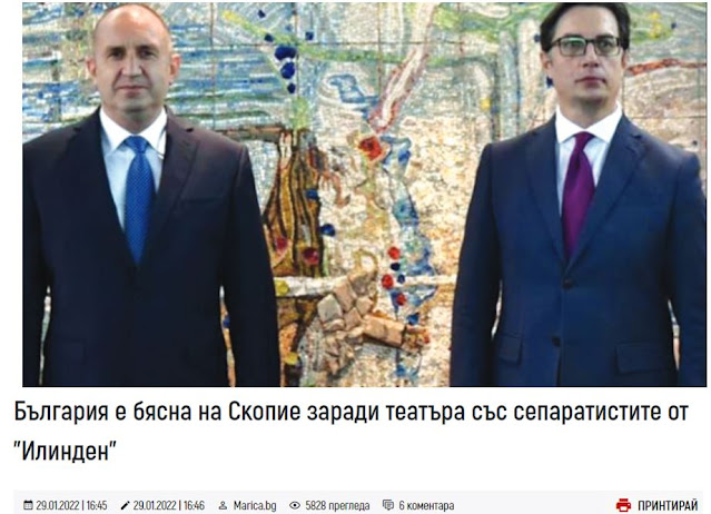 «Ο πρόεδρος των γειτόνων Στέβο Πενταρόφσκι εξόργισε το Υπουργείο Εξωτερικών μας με την απόφαση να αποδεχτεί τη φανταστική οργάνωση «Ίλιντεν», που ισχυρίζεται ότι ενώνει τους Μακεδόνες στη Βουλγαρία», γράφει βουλγαρικό δημοσίευμα.