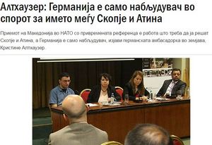 «Φυσικά είναι σημαντικό το γεγονός ότι ο υπουργός Νίκολα Ντιμιτρόφ σε μια από τις πρώτες συναντήσεις του πήγε στην Αθήνα. Το ζήτημα αυτό δεν θα ήθελα να το σχολιάσω γιατί είναι δουλειά των δύο χωρών. Η Γερμανία είναι απλά ένας παρατηρητής», δήλωσε η Αλτχάουζερ σε εκδήλωση επιχειρηματιών που διοργανώθηκε στη γερμανική πρεσβεία στα Σκόπια.