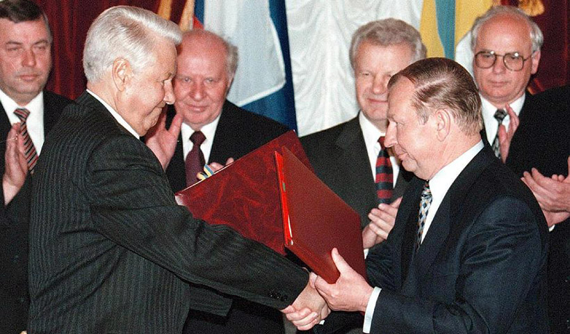 Μπόρις Γιέλτσιν και Λεονίντ Κούτσμα μετά την υπογραφή της Συνθήκης Φιλίας (1997)