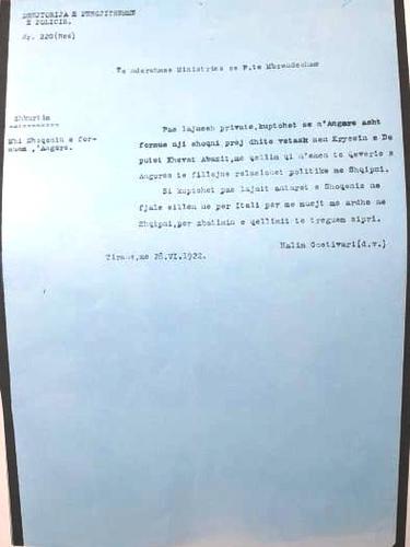 Στις 28.6.1922 η Γενική Διεύθυνση Αστυνομίας ενημερώνει το Εντιμότατο Υπουργείο των Εσωτερικών δια της Εκθέσεως αρ. 220 και την υπογραφή του Χαλίμ Γκοστιβάρι: